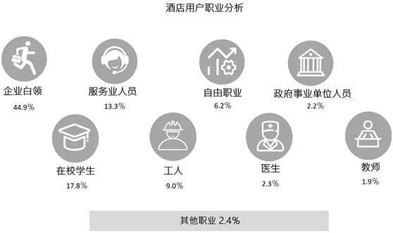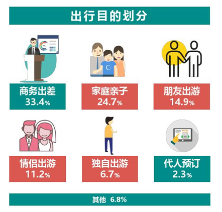 從數(shù)據(jù)上看,在酒店入住人群出行目的中,商務(wù)出差比重高達33.4%。商旅與酒店聯(lián)系十分緊密,所以酒店設(shè)計可以在一定程度上加重商務(wù)功能,特別是商務(wù)酒店設(shè)計時,對于商務(wù)功能及空間設(shè)計上要有更高更人性化的要求。