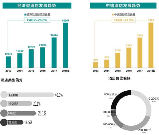 滿足居民百姓日益增長的住宿需求的仍然占據(jù)主流市場空間,針對酒店類型、價位偏好調(diào)研顯示,經(jīng)濟型酒店仍是出行首選。但隨著商務(wù)人士以及國內(nèi)外游客的旅游消費升級使得酒店需求趨于多元化,中端的個性化需求快速增長,中端酒店正進入規(guī)模化的快速發(fā)展期。而且,相比經(jīng)濟型酒店,中端酒店的拓展過程中外部進入的行業(yè)競爭者沒有那沒多。高端酒店的發(fā)展將更加關(guān)注個人消費的細(xì)分需求,提供個性而高質(zhì)量的服務(wù)。