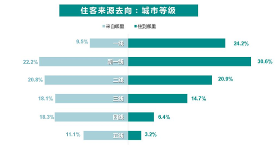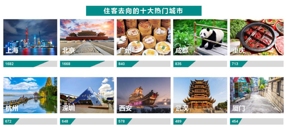 在對住客的去向及地點偏好調(diào)查中,五成以上用戶選擇住到一線及新一線城市的酒店,在住客最喜歡的城市排行中,北上廣依舊是最熱門城市,成都、重慶、杭州、西安、武漢五大新一線城市皆入圍。